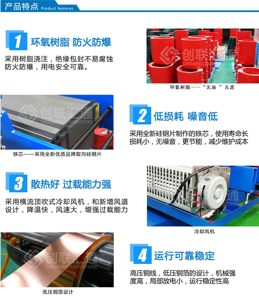 3、結(jié)構(gòu)堅固,SCB11干式變壓器繞組采用環(huán)氧樹脂澆注固化成型,機(jī)械強度高,抗短路能力強。