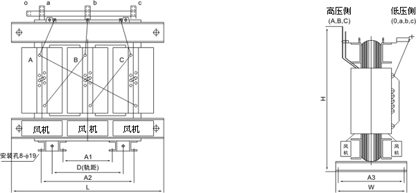 注:容量200kVA及以下不帶風機,否則在訂貨時需闡明。本表之外的規(guī)格和特殊要求可聯(lián)系洽談。