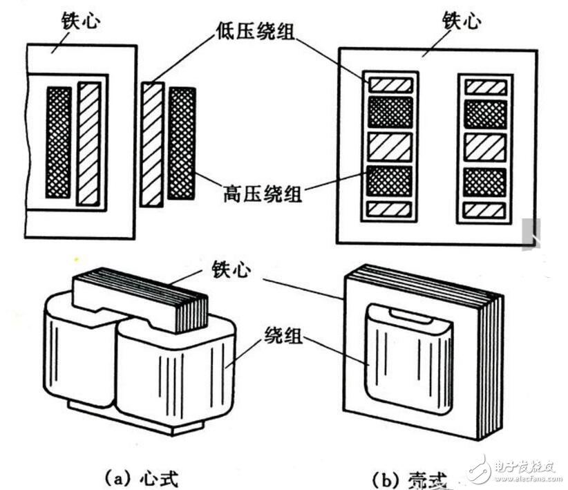 變壓器按鐵芯和繞組的組合體例,可分為心式和殼式兩種,以下圖所示。